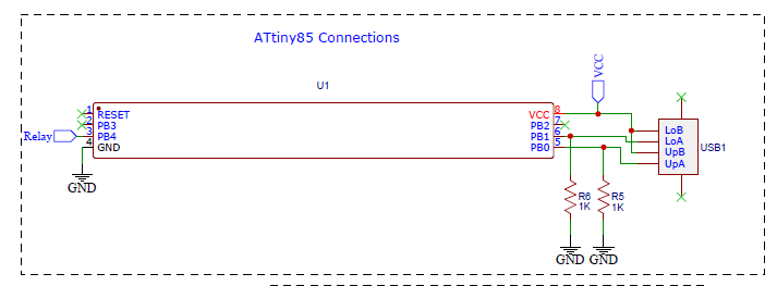 Here we can see that we use pin 4 as output for relay cignal and the pin 5 and 6 as input with pulldown resistor to prevent undefined state of the pins and the connected the USB that is connected to the readswitch. Take note that I use a male USB and cut its end so I can connect it to the reed switch on the pipe like in the diagram so its not included on the board design.
